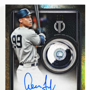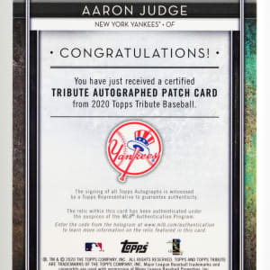 Serially numbered #1/1. Add some thump to your Bronx inventory with the offered 2020 Topps Tribute Aaron Judge certified autograph/game-used patch. This verified material of the New York Yankees slugger is two-color and accompanied by an MLB authentication hologram.