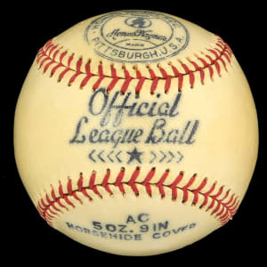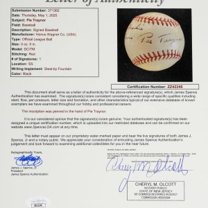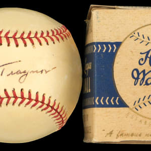 Presented is an exquisite example of a baseball signed by Hall of Fame third baseman Pie Traynor across the sweet spot. Traynor's signature has been scripted in dark ink, and he has added the personalization "To Fredie, From" preceding his name. Pie Traynor was widely considered the finest fielding third baseman of his era. He was so adept in the field that most fans today are unaware that he finished his career with a .320 lifetime average and twice batted over .350 in a season. Traynor, who was elected to the Hall of Fame in 1948, died in 1972, years before collecting single-signed baseballs of Hall of Famers became extremely popular with collectors. As a result, Traynor single-signed balls are scarce. This is just the third we have ever offered, and we cannot recall having seen many others, especially high-grade examples such as this. The offered baseball is, appropriately, a Honus Wagner Co. Official League baseball. Wagner was the star of the Pirates prior to Traynor's arrival, but the two would partner later in life on a sporting goods store. The baseball remains in Excellent to Mint condition and is ideally accompanied by the original box (the bottom panel is neatly separated). This is a remarkable surviving example of this particularly scarce and desirable Hall of Fame signed baseball! Full LOA from James Spence/JSA.