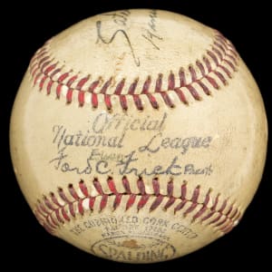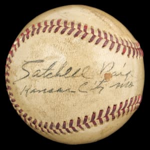 Satchel Paige will always be one of the most legendary names in Negro League baseball. Paige, who enjoyed time in the Major Leagues following almost two decades in the Negro Leagues, was a rare talent acknowledged contemporaneously as one of the best to ever play the game. Paige has signed this Official National League (Ford Frick) baseball on the side panel, adding the inscription "Kansas City Mo" underneath his name. This is one of only a few examples with an inscription representing Paige's team, the Kansas City Monarchs, we have ever seen. Vintage signed Paige signatures are scarce. When it comes to extreme scarcities, condition is often a passing afterthought, and that holds true with the offered example, which presents well save for a tiny abrasion affecting the beginning of Paige's name. The signature and inscription is boldly placed on the baseball, which exhibits moderate toning as well as some light staining and surface imperfections, which do not otherwise impact the signed area. This is a very special and rare example of a single-signed Satchel Paige baseball dating to his early days as a member of the legendary Kansas City Monarchs. Full LOA from James Spence/JSA.