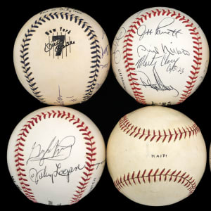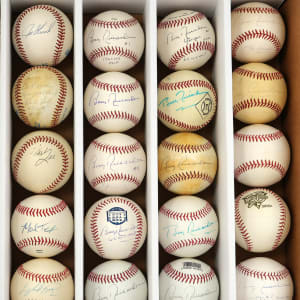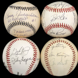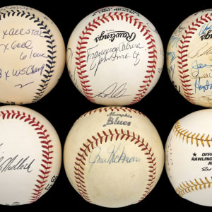 Go long on Bobby Richardson, with the capture of this signed baseball collection (30). The slick-fielding, clutch-hitting 1960s Yankees star figures prominently in this offering, with (20) single-signed balls, and another (2) multi-signed that bear his signature. Most of the signatures in this collection are pleasing examples, however several of the Richardson single-signed balls bear considerably faded autographs.