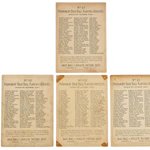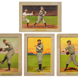 Round tripper of 1911 T3 Turkey Red Cabinets Chicago Cubs premiums with checklist backs. The following North Siders are included: 1.) #32 Overall (FR); 2.) #33 Pfeister (FR, stain); 3.) #47 Chance (FR, slight front paper pulling) and 4.) #102 Kling (PR, reverse tape residue).