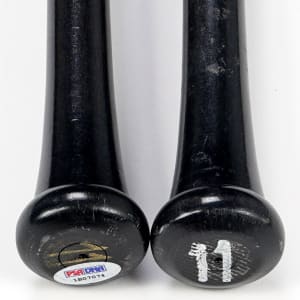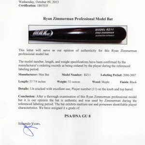 Both of these crack-free Max Bat black bats are labeled “Model RZ11, Ryan Zimmerman, Washington Nationals” on the barrels. Both bats have Zimmerman’s uniform number “11” written on the knob, and both show excellent signs of authentic game use, including considerable gripping agent residue on the upper handles, and multiple contact marks on the barrels. One bat is signed (“8”) on the barrel in silver, with the inscription “Game Used 2007”. This bat comes with an MLB sticker for the signature, and a PSA/DNA sticker for game use. While the LOA from PSA/DNA is absent, a website printout indicates a PSA/DNA game use grade of (GU 8). The other bat comes with a full LOA from PSA/DNA, with a stated rookie era labeling period of "2006-2007", and a game use grade of (GU 8).