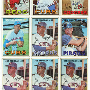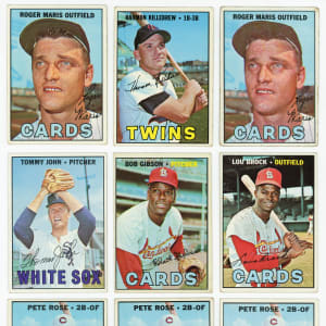 A heaving assortment of (1,125+) 1967 Topps singles featuring a sampling of Hall of Famers and stars along with (25) tougher high numbers. This bundle generally presents in the (FR to GD) range with some better or lesser. Keys include: (2) #45 Maris (GD, FR), #210 Gibson (VG), #285 Brock (VG), #315 B. Williams (EX), #333 Jenkins (GD), (4) #337 Morgan (average FR), (3) #430 Rose ((2) VG, GD), #445 Sutton (VG), #460 Killebrew (VG), #476 Perez (VG), #510 Mazeroski (VG) and #609 John (VG).