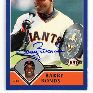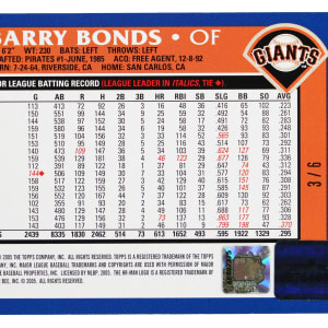 With no recorded sales and hobby pack odds of (1:222,792), the offered 2005 Topps Barry Bonds #6 MVP Autographs modern insert is among the all-time home run leader's very finest! These near impossible-to-find "on card" autographs were each serially numbered to the number of each National League MVP Award with the cards emulating that season. For example, the offered #6 Bonds autograph is serially numbered #3/6, representing his sixth MVP won in 2003. Despite moderate corner wear, the blue Sharpie signature is absolutely flawless. Want a challenge? Try finding another one available for public sale!