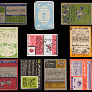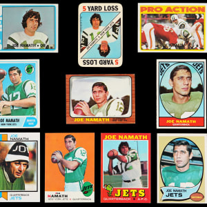 Earn "Broadway Joe" bragging rights with the offered run of (10) 1966-1973 Topps Football Joe Namath singles. Includes: 1966 Topps #96 (VG-EX), 1967 Topps #98 (EX), 1968 Topps #65 (VG-EX), 1969 Topps #100 (EX-MT), 1970 Topps #150 (EX), 1971 Topps #250 (EX-MT), 1971 Topps Game Insert #3 (EX-MT), 1972 Topps: (2 cards) with #100 (EX-MT), #341 IA (EX-MT) and 1973 Topps #400 (EX-MT).