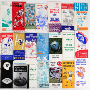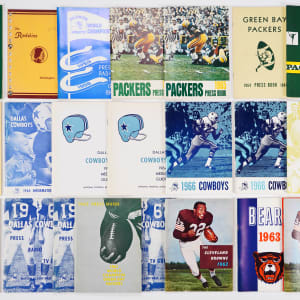 Publications purists, find the end zone over and over with this tremendous hoard of 599 media guides from the 1946-1969 NFL and AFL seasons. Several rare early NFL guides lead the charge downfield, in the form of 5 examples published in 1946, including the Packers, Redskins, and Lions. Picking up in 1960, this vast selection boasts a good number of prized Packers and Cowboys editions, which are considered to be tougher acquisitions. Dozens of always-in-demand AFL guides are in play, and the proud bald eagle mascot graces the front cover of a 1961 Eagles edition, representing the 1960 NFL champions. Other highlights are an impressive 1962 Browns guide with a full-page cover photograph of unstoppable force Jim Brown, and a very attractive 1960 Colts edition, with a World Champions 1958-1959 banner. Condition is surprisingly pleasing for the great majority, ranging 80% EX to NM-MT, 15% VG to VG-EX, 5% lesser.