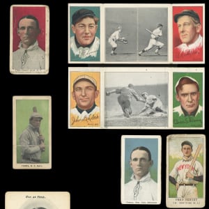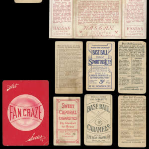 From the family archive of former Big Leaguer Fred Tenney arrives this collection of (10) circa 1910s singles. Includes: 1906 WG3 Fan Craze (GD), 1908 E91-A American Caramel (FR), 1909 E91-B American Caramel (PR), 1909-1911 E90-1 American Caramel (PR), 1909-1911 T206 White Border (trimmed, Sweet Caporal 150 Subjects back), 1910 E98 Anonymous Set of 30 (PR, writing, Green Background), 1910 E103 Williams Caramel (FR), 1910-1911 M116-1 Sporting Life Blue (VG), 1912 T202 Hassan Triple Folders: (2 cards) with Lobert/Lobert Gets Tenney/Dooin (FR) and Raymond/Tenney Lands Safely/Latham (FR).