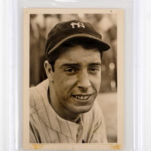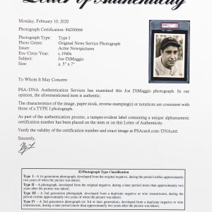 Picture yourself as the owner of this circa 1940s Joe DiMaggio original news service photograph, and make it happen. Coming off four consecutive World Series championships from 1936-1939, the Yankees continued their great success during the 1940s, and DiMaggio was a big part of it. On top of the four World Series rings he won during his first four years in pinstripes, "Joltin' Joe" added three more championships in the '40s, and also picked up his second and third MVP awards. There was also his remarkable 56-game in 1941, and were it not for three seasons lost to military service, his awards collection would likely have been even bigger. This 5x7 close-up portrait sees the Hall of Fame slugger in his Yankees uniform. A nice period prize from DiMaggio's active playing days, this photograph is encapsulated by PSA/DNA with a (Type I Authentic) designation.