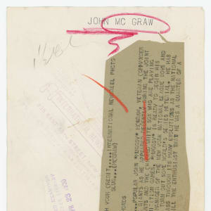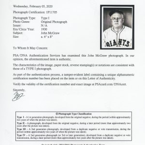 Measuring 6x8, this vintage Type I photograph depicts McGraw in uniform for the Giants, near the end of his hard-fought career. A reverse side stamp credits International News Reel, and an affixed text blurb is dated 4/12/30. The text details a barnstorming tour, with McGraw's Giants facing the Chicago White Sox in a series of exhibition games. Condition is technically (GD) due to rippling along the bottom from moisture contact, though otherwise this photograph is fairly attractive, with a distinct image, and decent gloss, and it should frame up nicely.