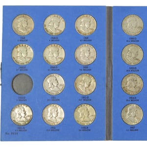 Highlighting this offering, is a 1948-1963 Franklin half dollar near-complete set (34/35), absent only a 1950-D example for completion. Housed in a Whitman folder, these coins range (FN to AU).