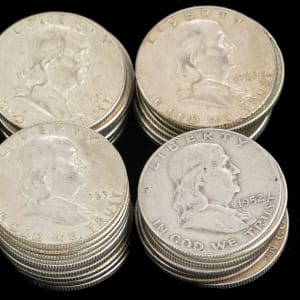 Founding Father Benjamin Franklin is literally on the money, with this 1948-1963 Franklin silver half dollar collection (84). Boasting a 90% silver composition, these vintage coins honor the renowned polymath with a profile portrait on the obverse, while the reverse honors our national symbol of independence, the Liberty Bell. With silver trending up in value for the past few years, this bundle is a smart buy.