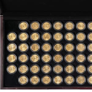 Washington gold-plated State quarter set (56) showing BU details, are housed in a deluxe presentation case;