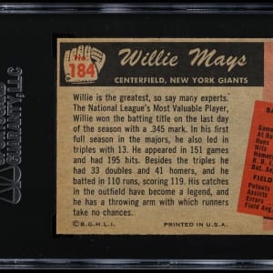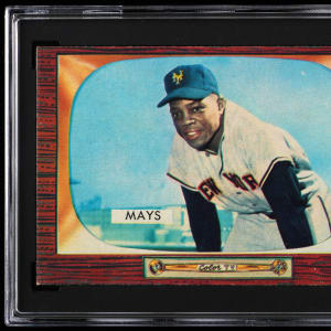 Graded NM 7 by SGC. As one of the linchpins to the final 1955 Bowman Baseball issue, finding high-grade copies of #184 Willie Mays is quite a feat! The offered gum card of the New York Giants Hall of Fame outfielder is particularly attractive by showcasing accurate centering, mostly sharp corners, unchipped wooden edges and dynamic visual accents. The reverse which proclaims "Willie is the greatest" is properly aligned and is wax stain-free. A prime selection that ranks in the upper 2.1% of all similar Mays examples judged by the authenticator.