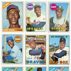 1969 Topps: 427 cards, average GD to VG, with #1 Yaz/Oliva LL (GD), #20 Banks (GD), (2) #49 Rodriquez ERR (VG-EX, VG), #50 Clemente (FR), #100 Aaron (GD).