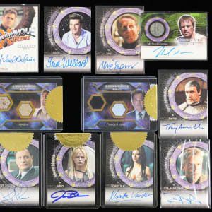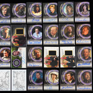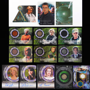 Nineteen factory certified autograph cards: Jolene Blalock in a holder with a gold foil seal; and Robert Picardo, Don Davis, Teryl Rothery, Anna-Louise Plowman, Jessica Steen, Sual Rubinek, Kristen Dalton, David Palffy, Michael Adamthwaite, Christopher Cousins, Rick Worthy, David DeLuise, Don Johnstone, Katie Stuart, George Wyner, Dom DeLuise, Tony Amendola, Christopher Judge. Twenty-one Relic prop cards with set of nine with #R1-#R9, and 12 duplicates, all limited-edition numbered. Eleven Costume swatch cards. Four SG-1 Team set with #S1-#S4. Four Stargate Casting Call set with #CC1-#CC4. Two Dr. Fraiser Tribute die cut card set with #F1-#F2. Nine Dr. Jackson In the Line of Duty set with #DJ1-#DJ9. Nine Teal’c In the Line of Duty set with #T1-#T9. Nine Behind the Scenes with Teryl Rothery set with #B10-#B18. Seventy-two Base card set with #1-#72. Three Promo card set with #P1-#P3. Promo card #UK. Five Miscellaneous: factory binder, Season 7 checklist sheet, Sci-Fi channel promo, retail box-flattened, wrapper.