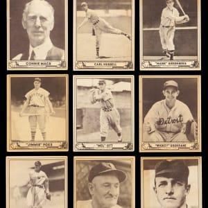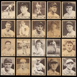 A stunning array of Hall of Fame talent is captured throughout the offered 1940 Play Ball Low Number near set of 176/180 cards. These 1930s-1940s big league stars and former major league greats have an overall approximate condition breakdown of 30% VG-EX or better, 45% VG and 25% GD or lesser with nearly 10% displaying perimeter trimming. Keys include: #6 Gomez (VG), #7 Dickey (GD), #10 Ruffing (VG), #21 R. Ferrell (EX), #30 Berg (VG), #38 Doerr (VG), #40 Greenberg (VG-EX), #41 Gehringer (VG), #46 Averill (VG), #87 Hubbell (EX), #88 Ott (VG-EX), #102 Klein (VG), #104 P. Waner (VG), #105 L. Waner (trimmed), #107 Vaughan (VG), #118 Hoyt (VG-EX), #119 Alexander (trimmed), #120 W. Johnson (VG-EX), #124 Combs (trimmed), #129 Harris (VG-EX), #132 Mack (VG), #133 Foxx (VG), #134 Cronin (VG), #141 Stengel (VG-EX), #142 G. Kelly (trimmed), #153 McKechnie (VG-EX), #158 T. Jackson (VG), #167 Frisch (VG), #168 H. Wagner (VG), #170 Speaker (VG-EX), #171 Heilmann (GD), #172 Bender (trimmed), #173 Lajoie (VG-EX), #174 Evers (VG), #175 Mathewson (FR), #176 Manush (VG), #177 Baker (VG), #178 Carey (GD), #179 Sisler (VG) and #180 Cochrane (VG-EX). Missing only #1 J. DiMaggio, #27 T. Williams, 49 and 61 for completion. Note: Due to rudimentary factory printing techniques of the age, centering/size variances are present.