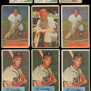 1954 Bowman: (253 cards, average FR to GD, includes 7 high numbers) with (2) #1 Rizzuto (one FR, one PR, reverse writing), (3) #6 Fox (GD, (2) FR), #15 Ashburn (PR, reverse glue residue), #45 Kiner (FR), #50 Kell (PR, reverse writing), (7) #62 Slaughter (average GD), (3) #64 Mathews (one GD, (2) PR with one reverse writing), (6) #101 Larsen RC (average FR);