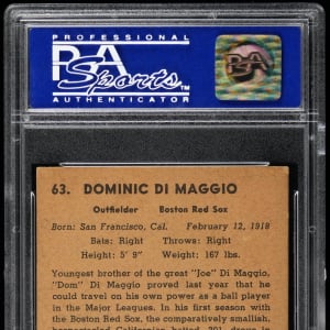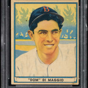Graded EX-MT 6 by PSA. "The Little Professor" aces the offered 1941 Play Ball #63 Dom DiMaggio high number. Boston Red Sox star outfielder.