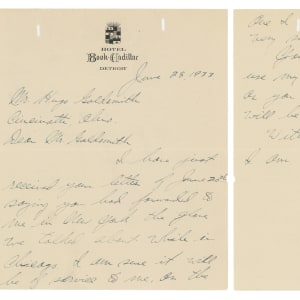 Hall of Famer Joe Sewell was in the final year of his playing career, when he wrote this letter to Hugo Goldsmith of GoldSmith Athletic Goods. Business was conducted in a simpler fashion when Sewell corresponded with Goldsmith, as evidenced by the contents of this handwritten letter. Written on Hotel Book-Cadillac, Detroit stationary, this 5" x 6" letter is dated 6/28/33. Sewell spent most of his career with the Cleveland Indians, however at this point, he was in the midst of the last season of his three-year stint with the New York Yankees.