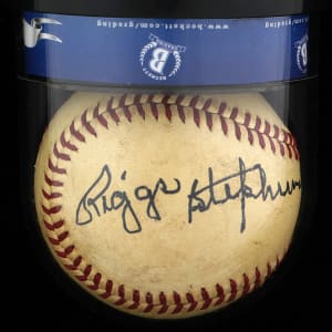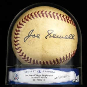 Early 1920s Cleveland Indians teammates Riggs Stephenson and Joe Sewell reunited some years later, to dual-signed the offered baseball. Traces of factory labeling on the sweet spot, suggest this ball is a 1940s OAL/Harridge model. Both signatures are bold examples, with Hall of Famer Sewell ("9.5") on the west panel, and career .325 hitter Stephenson ("10") on the east panel. Beckett Authentication Services has encapsulated this vintage orb with an (Authentic) designation.