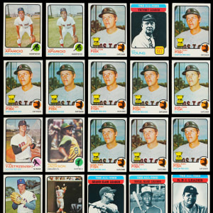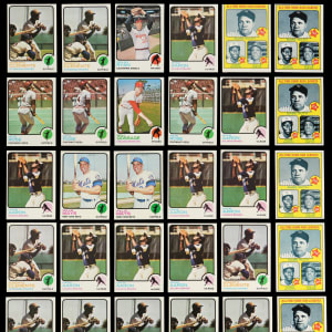 A potential grading opportunity awaits the winner of the offered 1973 Topps collection of 1,600+ cards. This sparkling collection includes a #1-528 low number set plus 1,125+ dupes mostly numbered from #1-209. While not entirely comprised from vending, the lion’s share of these cards showcase strong corners, creamy edges and fresh surfaces. While moderate instances of factory-errant centering are present, the overall quality of these cards is undeniable. Highlights include: six #1 Ruth/Aaron/Mays (a couple off-centered), nine #50 Clemente, eight #100 Aaron, three #130 Rose, #174 Gossage RC, ten #193 Fisk, #220 Ryan, #245 Yastrzemski, #255 R. Jackson, two #305 Mays, #350 Seaver, #380 Bench, #472 Gehrig LDR, #473 Aaron LDR and #474 Ruth LDR.
