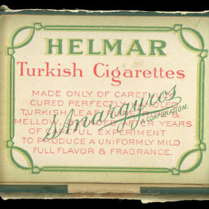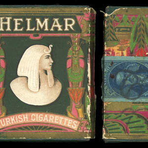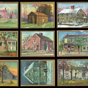 Non-sport aficionados make a nice score, with this 1911 T69 Helmar Historic Homes near-complete set (49/50). These antique tobacco package premiums depict homes of famous figures, such as the log cabin birthplace of Abraham Lincoln, the Stratford-On-Avon birthplace of William Shakespeare, the House of Seven Gables, Mount Vernon, William Penn's house in Philadelphia's Fairmount Park, the Hermitage, and other interesting structures. Gold borders make this series a condition sensitive issue, and this collection shows up respectably, ranging (80% GD to VG+, 20% lesser). Also present are (1) duplicate card, and a sweet little bonus, in the form of an original period Helmar Turkish Cigarettes box in very attractive state, with bold graphics/colors, and a 1910 dated revenue stamp firmly affixed to the back.