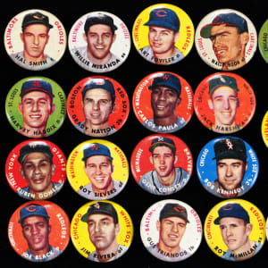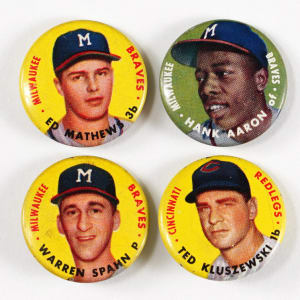 Pin the winning bid to this exciting 1956 Topps Pins starter set of (23) different. An early Topps foray into the oddball issue realm, these 1-1/8” diameter pins feature the same photos that are seen on their cardboard counterparts that populate the 1956 Topps Baseball card set. These vibrantly colored pins are well known for being condition sensitive, and overall this bundle is respectable, reporting in average (EX-MT) condition with some better or lesser. Includes: Aaron (EX-MT), Black, Conley, Donovan, Fowler, Gomez, Haddix, Harshman, Hatton, Hegan, Kennedy, Kluszewski (EX-MT), Mathews (NM), McMillan, Miranda, Moon, Paula, Rivera, Sievers, H. Smith, Spahn (EX-MT), Tremel and Triandos.