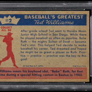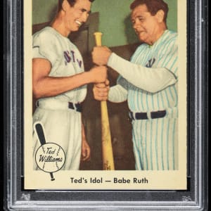 Graded MINT 9 by PSA. Two of the greatest American League sluggers are pictured on one card with the offered 1959 Fleer Ted Williams #2 "Ted's Idol - Babe Ruth." With a combined 1,235 home runs and 5,527 base hits, few cards could boast such thump! This sensational rendition of their 1943 All-Star Game meet-up ranks in the upper 2.9% of all similar copies judged by the grading service. Shares the spotlight with 34 other copies at the MINT 9 tier with none better.