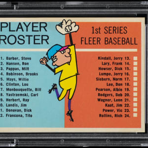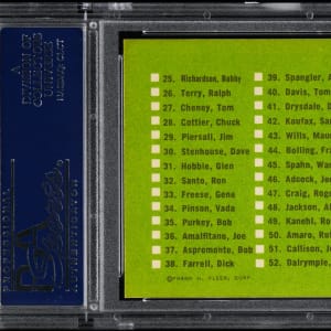 Graded NM-MT 8 by PSA. The offered 1963 Fleer Checklist somehow eluded the pens and pencils of its original owner(s)! This unnumbered player ledger is accurately centered with razor-sharp corners, creamy edges and fresh surface colors with entertaining period graphics. Ranks in the upper 16% of all similar checklists judged by the grading service.