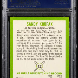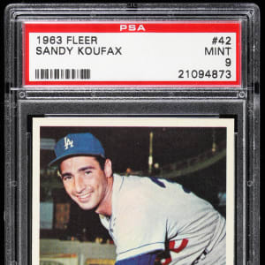 Graded MINT 9 by PSA. More dizzying than a commanding fastball, this 1963 Fleer #42 Sandy Koufax is ideal for fans of the Los Angeles Dodgers Hall of Fame fireballer. The crisp 62-year-old centerpiece has escaped the centering woes and wax staining that so frequently plagues this issue. The southpaw's stadium setting is surrounded by razor-sharp corners, bright white edges and radiant surface hues. Ranks in the upper 2.8% of all similar copies judged by the grading service.