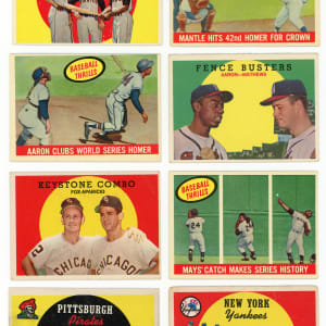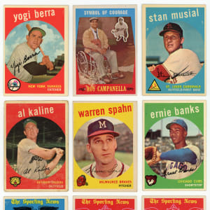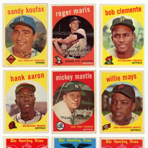 Rock solid 1959 Topps near complete set of 561/572 cards featuring most of the set's Hall of Fame core. This acclaimed edition has an approximate condition breakdown of 15% EX or better, 25% VG-EX, 35% VG and 25% GD or lesser with the challenging high series generally presenting on level with the more available numbers. Highlights include: #1 Frick (VG-EX), #10 Mantle (PR), #20 Snider (FR), #40 Spahn (VG), #50 Mays (VG-EX), #150 Musial (VG-EX), #163 Koufax (GD), #180 Berra (VG-EX), #202 Maris (EX), #212 Aaron/Mathews (VG-EX), #350 Banks (VG-EX), #360 Kaline (FR), #380 Aaron (VG-EX), #387 Drysdale (VG), #408 N. Fox/Aparicio (GD), #430 Ford (GD), #435 F. Robinson (EX), #439 B. Robinson (VG), #450 Mathews (VG), #461 Mantle HR (VG), #464 Mays Catch (VG-EX), #467 Aaron HR (VG), #478 Clemente (VG), #509 Cash RC (EX), #510 Yankees Team (PR, reverse writing), #515 Killebrew (GD), #528 Pirates Team (VG), #543 Corsair Trio/Clemente (VG-EX), #550 Campanella (VG-EX), #559 Banks AS (EX-MT), #561 Aaron AS (VG-EX), #562 Kaline AS (EX), #563 Mays AS (VG), #564 Mantle AS (VG), #571 Spahn AS (EX-MT) and #572 Pierce AS (VG-EX). Missing only #8 Phillies Team, 85, #317 Ashburn/Mays, #338 S. Anderson RC, 440, 476, #514 Gibson RC, 552, 556, 558 and 569 for completion.