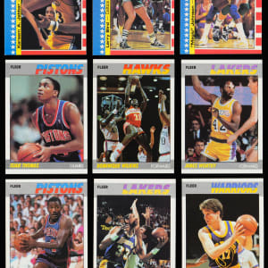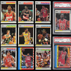 The sky's not the limit for the offered 1987-1988 Fleer Basketball complete set featuring a pair of gravity defying "Air Jordan" second-year singles. In addition to a 132-card base set, the 11-sticker subset is also present. Grades (NM to Mint) quality throughout and is highlighted by the following: #9 Barkley (NM-MT), #11 Bird (NM), #30 Drexler (NM-MT), #35 Erving (NM-MT), #37 Ewing (NM), #56 M. Johnson (NM-MT), #59 Jordan (PSA NM-MT 8), #68 K. Malone (NM-MT), #80 Olajuwon (NM), #2 Jordan Sticker (PSA NM-MT 8) and #6 Barkley Sticker (NM).