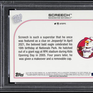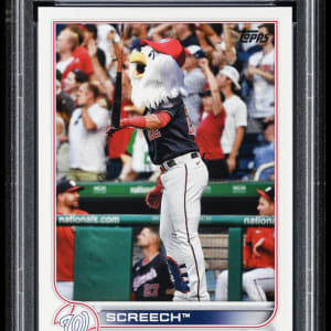 Graded GEM MINT 10 by PSA. Juan Soto, ahem, "Screech" bat flips his way into trading card history with the offered 2020 Topps Update #150 super shortprint. Only 11 total copies of this Washington Nationals mascot have been judged by the grading company.