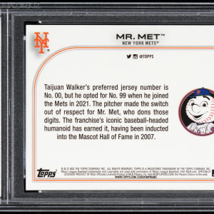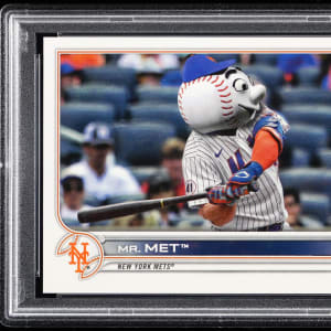 Graded GEM MINT 10 by PSA. A jolly "Mr. Met" (who curiously resembles Pete Alonso) goes deep on the offered 2022 Topps #315 ultra short print. Only four total copies of this near impossible New York Mets mascot have been judged by the grading service!