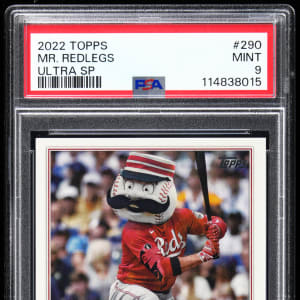 Graded MINT 9 by PSA. A mustachioed "Mr. Redlegs" barrels up this near impossible 2022 Topps #290 ultra short print. Only 7 total examples of this Cincinnati Reds mascot have been evaluated by the grading service.
