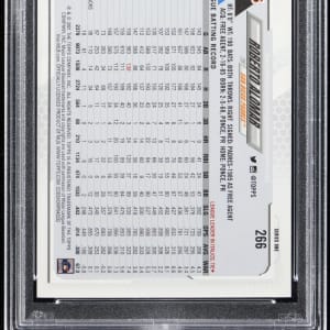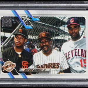 Graded GEM MINT 10 by PSA. Featured is a 2021 Topps #266 Roberto Alomar ultra shortprint. Only 7 total copies of this modern insert have been evaluated by the grading service. Robby's father Sandy Alomar Sr. and brother Sandy Alomar Jr. are also pictured.