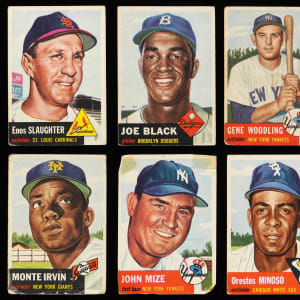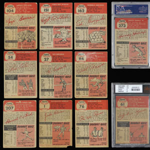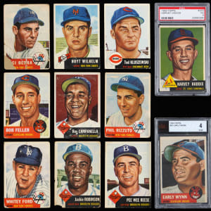 Sophomore 1953 Topps partial set of (226/274) cards heralded by lead-off man Jackie Robinson, additional Hall of Famers and a pair of graded examples. This assembly has an approximate condition breakdown of 20% (VG or better), 25% (GD), 30% (FR) and 25% (PR or Authentic) with a percentage displaying paper loss/residue, pin holes, tape, trimming and/or writing. Includes (26) tougher high numbers that average (PR to FR) condition. Highlights include: #1 J. Robinson (Authentic, missing corner), #27 Campanella (FR), #41 Slaughter (FR), #54 Feller (FR), #61 Wynn (BVG VG-EX 4), #62 Irvin (PR), #66 Minoso (FR), #76 Reese (VG-EX, stain), #77 Mize (Authentic, tape), #81 Black (VG), #104 Berra (Authentic, paper loss), #114 Rizzuto (FR, reverse residue), #125 Di. Williams (PR), #149 D. DiMaggio (GD), #151 Wilhelm (GD), #162 Kluszewski (VG), #191 Kiner (PR), #207 Ford (PR, pin holes), #254 Roe (PR), #264 Woodling (FR), #265 Jensen (FR, stain) and #273 Haddix RC (PSA VG 3). Note: Our consignor was an "OBC" collector (a hobby organization that emphasizes completion rather than condition), as such, multiple cards in this collection may be extremely low-grade.