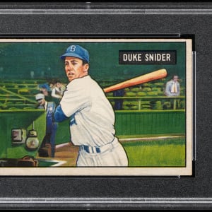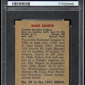 Graded EX 5 by PSA. Brooklyn Dodgers Hall of Fame slugger Edwin (Duke) Snider. This horizontal beauty is crease-free with bold surface colors and the gray biographical back is clean.