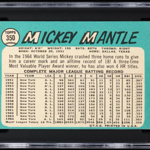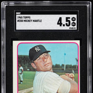 Graded VG/EX+ 4.5 by SGC. Classic 1965 Topps #350 Mickey Mantle ball card. The New York Yankees Hall of Fame slugger surveys his batting handiwork on this mid-grade action pose.