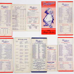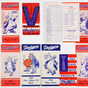 Get a fantastic look at the Dodgers days in Brooklyn, with this 1943-1953 player roster and media guide collection (9). This vintage collection starts with WWII examples, and concludes during the Korean War era. These were the high voltage Jackie Robinson years, when the color line was crossed, and baseball stared integrating. Literally a game-changer of great historic importance, Robinson is listed in (6) of these guides, which are blessed with captivating illustrations and graphics. The "Boys of Summer" are well-represented, with Robinson's teammates listed, including Roy Campanella, Gil Hodges, "Pee Wee" Reese, Carl Furillo, "Duke" Snider, Carl Erskine, Ralph Branca, Don Newcombe, and many others seen variously throughout this collection. Most editions bear handwritten notations on the interior, typically in the form of check marks or lines, otherwise these appealing relics show average VG to VG-EX details.