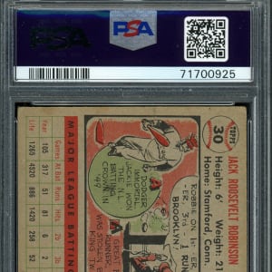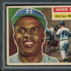Graded VG+ 3.5 by PSA. Slide, Jackie, slide! Brooklyn Dodgers Hall of Famer Jackie Robinson eludes a catcher's tag on his final Topps flagship card. This centered gray back is crease-free with only modest corner wear.
