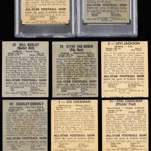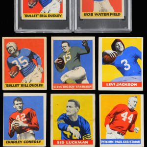 1948 Leaf Football Low Number partial: (24/49, average FR to GD with one graded, plus one dupe) with #1 Luckman RC (GD, Yellow Background), #5 Le. Jackson RC (VG, Blue Jersey), #21 Christman RC (VG), #36 Dudley RC (PSA EX-MT 6, mc);