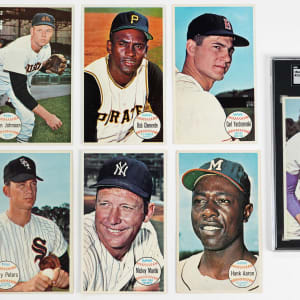 Sizzling 1964 Topps Giants near set of (59/60) cards. This large format collection generally presents in the (EX to EX-MT) range with some better or lesser. Highlights include: #3 Koufax (SGC VG/EX+ 4.5), #11 Clemente (VG), #25 Mantle (EX-MT), #48 Yastrzemski (EX-MT) and #49 Aaron (VG). Missing only #51 Mays for completion.