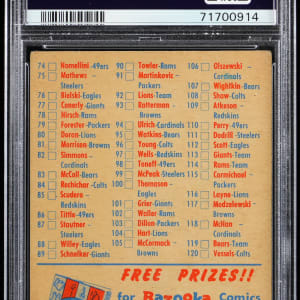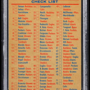Graded VG 3 by PSA. The offered 1956 Topps Football Checklist (#1-120) is one of but a few to have escaped the clutches of a careless youth. This unmarked specimen is crease-free and ideal for those gridiron hobbyists who want to finally put this inaugural gridiron issue to bed.