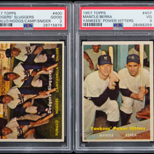 What a Combo! Of the six players found on the offered pair of 1957 Topps specialty cards, a whopping five would be inducted into the National Baseball Hall of Fame (sorry, Carl Furillo). Each graded by PSA. Includes: 1.) #400 Dodgers' Sluggers (PSA GOOD 2) with Furillo, Hodges, Campanella, Snider and 2.) #407 Yankees' Power Hitters (PSA VG 3) with Mantle and Berra.