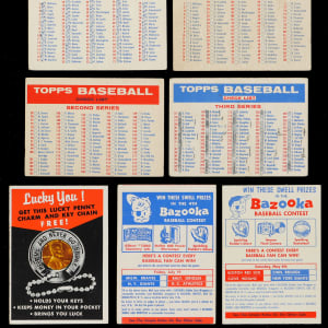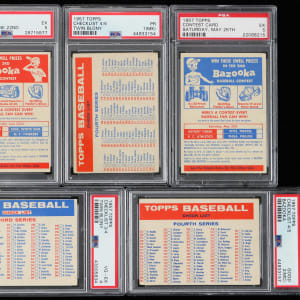 Master set collectors will not want to miss the offered 1957 Topps unnumbered set of (13) cards with five PSA graded examples featuring all variations, contest cards and a Lucky Penny insert. Includes: PSA Graded: (5 cards) with NNO Checklist 3/4 (PSA VG-EX 4, Twin Blony), NNO Checklist 4/5 (PSA GOOD 2, mc, Bazooka), NNO Checklist 4/5 (PSA POOR 1, mk, Twin Blony), NNO 5/25 Contest (PSA EX 5), NNO 6/22 Contest (PSA EX 5); Ungraded: (8 cards) with NNO Checklist 1/2 (FR, Bazooka), NNO Checklist 1/2 (marked, Big Blony), NNO Checklist 2/3 (marked, Bazooka), NNO Checklist 2/3 (PR, erased writing, Big Blony), NNO Checklist 3/4 (marked, Bazooka), NNO 5/4 Contest (EX, Bazooka), NNO 7/19 Contest (VG, Bazooka) and NNO Lucky You! Insert (GD).