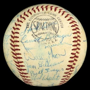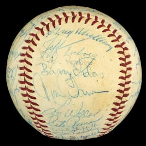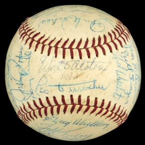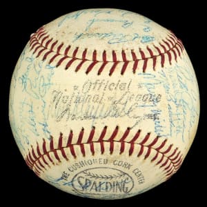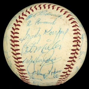 The Dodgers move to Los Angeles from Brooklyn after the 1957 season, paid big dividends over the next decade, with 4 NL pennants, and 3 World Series championships. This was the Sandy Koufax-Don Drysdale era, when the Dodgers leaned heavily on their pitching staff for success. Koufax and Drysdale are joined by many of the 1963 World Series champs, in the signing of the offered 1963-1964 Los Angeles Dodgers team-signed baseball. This period signed ball in an ONL/Giles model, covered with a whopping total of (35) signatures. Evidence points to this ball having been signed at the Dodgers 1964 spring training, as there are a couple minor leaguers in the mix, with Barry Staab and Barry Erdos, along with veterans Marv Breeding and Dick Nen, who did not make the Dodgers 1964 roster. The signature of manager Walt Alston is a clubhouse example, more than compensated for by the inclusion of coach Leo Durocher, and more importantly, Milwaukee Braves legendary slugger Hank Aaron. The baseball is fairly clean and attractive, with decent integrity of the factory labeling stamps, and the (35) signatures range ("5" to "7") in quality.