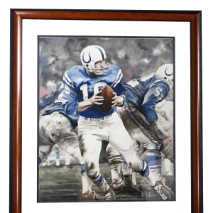 Whether you’re a football fanatic or an art aficionado, this original watercolor painting by renowned artist Rich Marks is sure to please. Grizzled Baltimore Colts field general Johnny Unitas certainly looks the part, as he drops back to put his golden arm into action in this captivating rendering of a game in progress. Marks' masterful use of somber colors suggests a storm is brewing for the Colts opposition in this dynamic work, centered by the Hall of Fame quarterback in front of ominous clouds. Seen in a visible area of 38” x 41,” this wall-hogging piece is housed in a massive frame, with overall dimensions of 48” x 55.” This magnificent work of art presents in excellent condition, and Marks has signed at bottom right.