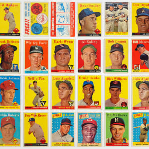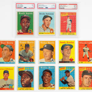 1958 Topps near: 490/494, 15% VG-EX or better, 30% VG, 30% GD, 25% FR or lesser, includes six PSA graded with #2 Lemon (PR), #5 Mays (PR), #25 Drysdale (GD), #30 Aaron (PSA EX 5), #47 Maris RC (PR, writing), #70 Kaline (trimmed), #71 Dodgers Team (VG), #85 Aparicio (EX), #88 Snider (GD), #90 Roberts (FR), #100 Wynn (VG-EX), 149 (PSA EX 5), #150 Mantle (PR), 152 (PSA EX 5), #162 Hodges (PR, pin hole), #187 Koufax (VG-EX), #230 Ashburn (PR), #238 Mazeroski (GD), #246 Yankees Team (GD), #285 F. Robinson (PR), #288 Killebrew (VG-EX), #307 B. Robinson (PSA EX-MT 6), #310 Banks (GD), #314 Snider/Alston (PR), #320 Ford (GD), #321 Kluszewski/Williams (trimmed), #343 Cepeda RC (FR), #368 Colavito (PR, tear), #370 Berra (PR), #375 Reese (VG), #400 Fox (GD), #420 Pinson RC (GD), #436 Mays/Snider (FR), #440 Mathews (EX), #464 Flood RC (VG), 468 (PSA VG 3), #476 Musial AS (VG), #482 Banks AS (VG), #484 F. Robinson AS (VG-EX), #485 T. Williams AS (FR), #486 Mays AS (VG), #487 Mantle AS (PSA NM 7, oc), #488 Aaron AS (GD), NNO 7/8 Contest (GD), NNO Team Emblems (VG-EX); Missing: Four cards with #1 T. Williams, #52 Clemente, #270 Spahn, #418 Mantle/Aaron;