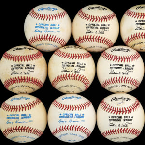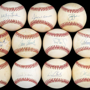 This nice collection of single-signed baseballs has signatures that average (“7 to 9”) and the balls themselves average creamy to white. The type of ball is in parentheses.